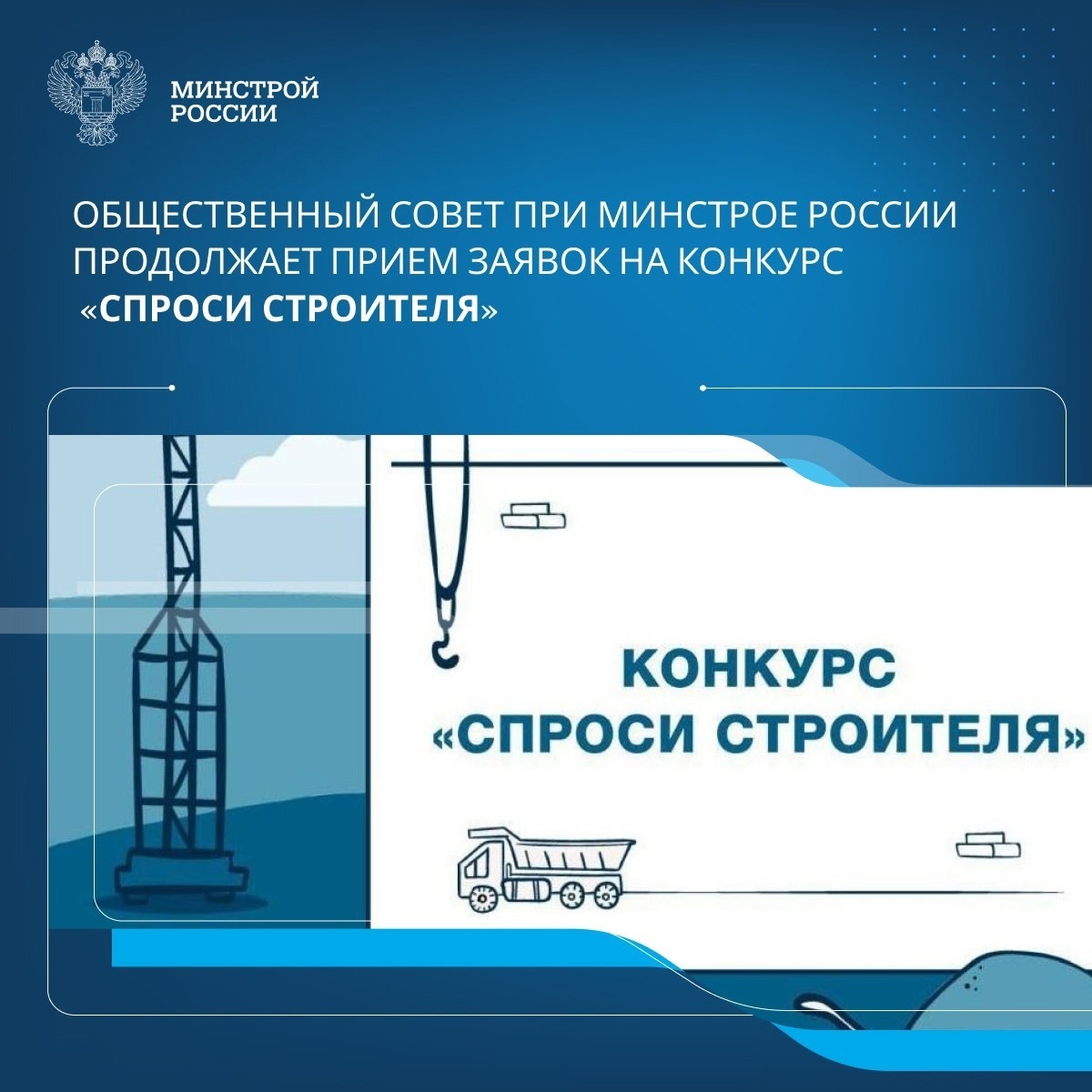Конкурс на лучший вопрос о строительстве и отраслевых специальностях проводится в восьмой раз в рамках реализации проекта популяризации строительных специальностей «Я-строитель будущего!». ➡️ По итогам конкурса на лучшие вопросы ответят Министр строительства и ЖКХ Ирек Файзуллин и Председатель Общественного совета при Минстрое России Сергей Степашин. В конкурсе могут принять участие дети и молодежь в возрасте от 6 до 17 лет. В конкурсе принимаются текстовые и видео-вопросы. Работы будут оцениваться по следующим номинациям: 🔵Самый оригинальный текстовый вопрос; 🔵Самый оригинальный видео-вопрос; 🔵Лучший вопрос об истории строительства. Подведение итогов конкурса состоится в августе 2025 года. Победителей ждет участие в торжественной церемонии награждения в рамках празднования Дня строителя-2025. По результатам конкурса будет обновлён состав Детского Совета при Общественном совете при Минстрое России, а победители в возрасте от 14 лет будут рекомендованы в состав Юношеского Сове