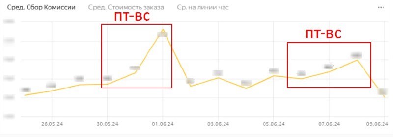 📇 ВЛИЯЕТ ЛИ СЕРТИФИКАЦИЯ НА ЗАКАЗЫ Давно хотел проверить влияет ли сертификация парка на заказы. В прошлую пятницу увидел, что нам ее вернули, возможно это было раньше, но как минимум выходные с пятницами можно уже сравнить. На скриншоте две недели — прошлая и позапрошлая⤴️ 📊 График показывает средний сбор комиссии парка, она зависит от выручки водителя, и мы можем проследить, в какие дни средняя выручка была больше или меньше. К сожалению, я не могу публиковать такие данные, поэтому цифры замазаны, но по графику вы можете увидеть, что разница незначительна, и в воскресенье 1 июня без сертификации выручка даже больше, чем 8 июня. А теперь в цифрах: ⬇️ 6 июня в прошлую пятницу с сертификацией средняя выручка была на 3% больше; ⬇️ в субботу разница пол процента; ⬇️ а 8 июня в воскресенье с сертификацией средняя выручка была меньше на 16%. 🙅♂️ Как видим, Яндекс не врёт, сертификация, действительно, не влияет на заказы. Возможно, кто-то из вас скажет, что период для сравнения мален