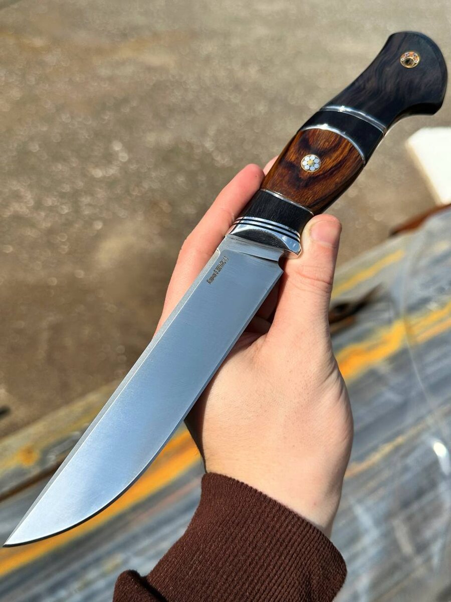 Рукоять на первом ноже выполнена из черного граба и железного дерева с мозаичным пином.