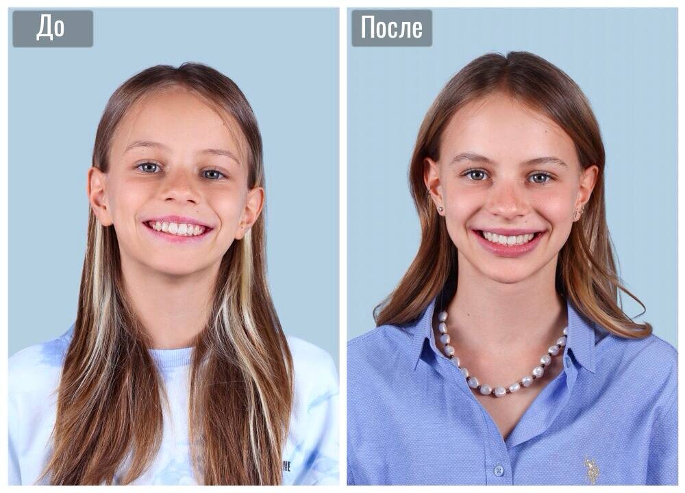 Мы рады поделиться с вами успешной трансформацией нашей пациентки. Из маленькой девочки она превратилась в прекрасную девушку с нашей небольшой помощью. Задача: у пациентки был дистальный прикус, а также сложности с прорезыванием постоянных зубов. Молочная пятёрка не сменялась, и для прорезывания семёрки не хватало места. При нарушении физиологической смены зубов это могло привести к анкилозу постоянного зуба. Анкилоз - это стоматологическое заболевание, при котором зуб сращивается с костной тканью. Лечение: Первым этапом мы провели расширение верхней челюсти с помощью аппарата Марко Роса. Затем пациентка носила эластопозиционер. Эластопозиционер - это резиновая каппа сразу для двух челюстей, которая позволяет гармонизировать рост верхней и нижней челюсти, а также правильно сопоставит их между собой. Данный аппарат носят ежедневно по 12-14 часов. Как правило легче надевать аппарат на ночь. А днем можно использовать правило 8х15 - надевать аппарат 8 раз в день и носить