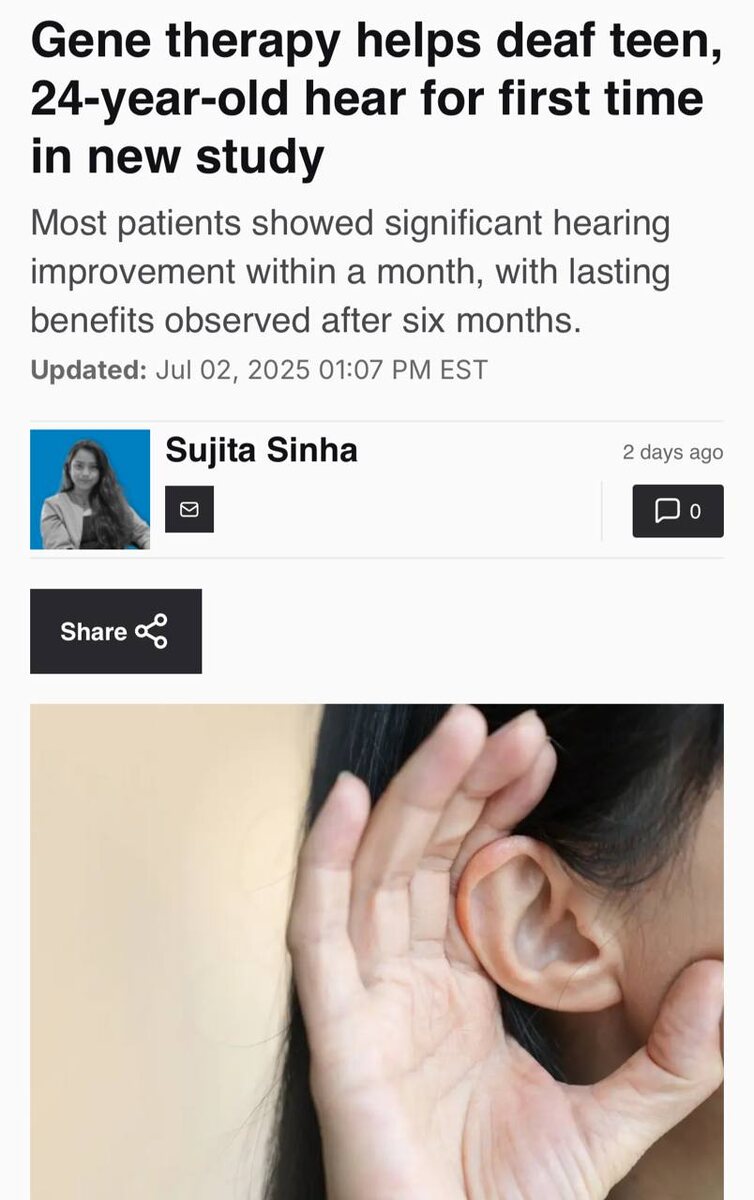 — Врачи ввели здоровые копии гена OTOF в уши 10 глухих пациентов.