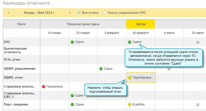 Где посмотреть график сдачи отчетности в Бухгалтерии предприятия 3.0 📅 Каждый бухгалтер любит четкость и не любит сюрпризы. Именно поэтому Календарь отчетности – отличный помощник в 1С для бухгалтеров и руководителей, он помогает своевременно планировать и готовить отчетность в контролирующие органы. ➡️Найти календарь отчетность в 1С Бухгалтерия предприятия можно в разделе Отчеты – 1С-Отчетность – Календарь отчетности. В нем можно сделать отбор по отдельной организации или по всем организациям, которые есть в базе. Помимо отчетности, в календаре есть сроки уведомлений по налогам (единое уведомление и по НДФЛ), налоговых платежей. 🚦Визуально календарь работает по методу светофора: ❗красный – просрочено (отчет не создан/не отправлен в прок) ⚠️желтый (отчет создан, но не отправлен, скоро истекает срок подачи) ✅зеленый (отчет сдан в срок) Пользуетесь ли вы календарем отчетности и может быть знаете еще более удобные инструменты для отслеживания сроков?