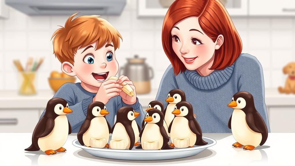 Весёлые банановые пингвины Сегодня на кухне Лёва задумался, как сделать что-то весёлое для полдника. Персик внимательно нюхает банан, а Лёва уже хихикает: — А если банан станет смешным пингвином? Понадобится: — спелый банан (1 штука) — немного чёрного шоколада (растопить с помощью взрослого) — палочки-пряники или посыпка для лапок — изюм или шоколадные капли для глаз Лёва с мамой аккуратно разламывают банан пополам. Взрослый помогает растопить шоколад. Лёва макает кончик банана в шоколад — это будет шапочка и крылышки пингвина. Приклеивает изюминки-глазки и пряничные лапки. Персик восхищённо скачет вокруг. Кажется, банан улыбается! Смешных пингвинов ставят на тарелку, чтобы шоколад застыл, зовут всю семью и дают Персику попробовать. Хотите сделать целую стаю банановых зверят? 🐧 Дайте волю фантазии и украсьте полдник вместе!