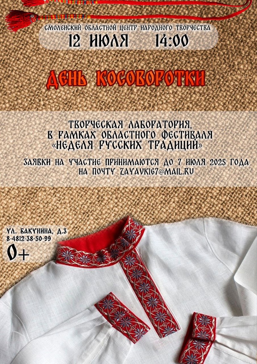 🌿12 июля в 14:00 на территории Центра народного творчества в рамках регионального фестиваля «Неделя русских традиций» состоится творческая лаборатория, посвященная Дню косоворотки, где вы: 🍀 узнаете об истории и особенностях традиционного русского костюма; 🍀 подробно изучите косоворотку: её происхождение, символику и значение; 🍀 попробуете свои силы в создании элементов традиционного костюма; 🍀 проведете время в душевной атмосфере, наполненной творчеством и любовью к русской культуре. 🌿Заявки на участие принимаются на адрес электронной почты zayavki67@mail.ru до 7 июля. ❗️Количество мест ограничено. ⤵️Подробности в Положении www.smolcentrnt.ru/files/493/... 📍Адрес: ул. Бакунина, 3 ⏰️Телефон: 8 (4812) 38-50-99 #СмоленскийЦентрНародногоТворчества