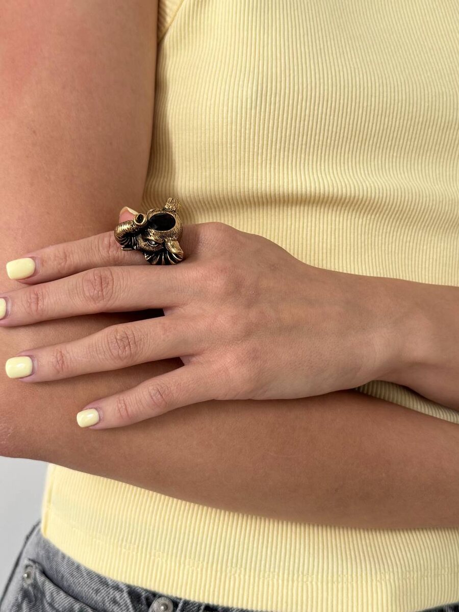 Акцентное кольцо выполнено из ювелирного сплава-брасс (золочение и патинирование