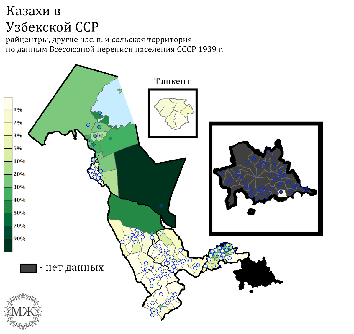 Казахов на 1939 год в Узбекской ССР было 305 тыс. человек или 4,9% от общего населения, что немногим меньше рассмотренных раннее таджиков. У казахов были выраженные зоны присутствия в республике, прежде всего в Каракалпакской АССР, которая была значительно больше, чем её преемник сегодня, включала Кызылкумскую пустыню (плато). Но по распределению, здесь жила лишь половина казахов, в то время как другая проживала в густонаселённых территориях Ташкентской области.