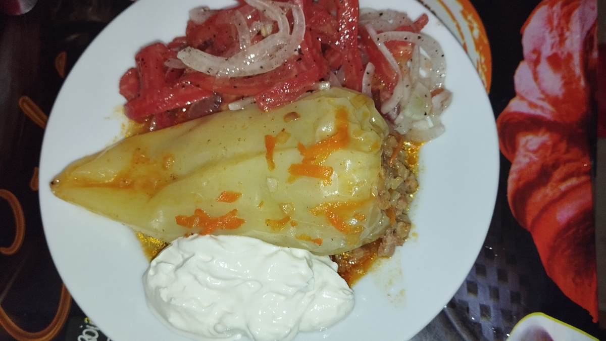 Привет всем 👋👋👋 Сегодня на ужин готовила фаршированный перец поверьте мне, получилось просто 💣 очень вкусно😋😋😋 Ходили сегодня на рынок, где я купила болгарский перец, который оказался очень сладкий, ароматный и совсем не горький. Если честно, я даже не ожидала, что такой бывает. Обычно попадается перец с горчинкой. Там же приобрели фарш крупного помола. У нас по субботам ярмарка, куда съезжаются фермеры и привозят свежую продукцию. Если есть возможность, я иду туда. Купили свежих розовых помидоров, которые тоже оказались сладкими и сочными. Было решено приготовить фаршированный перец. И к нему салат из помидор и лука. Получилась такая вкуснятина, что я осталась довольна, а муж просто был в восторге. Может потому что он принимал непосредственное участие в процессе готовки. Ну что, поехали? Можете брать те, которые вам больше нравятся, я сюда добавила универсальную. Я купила натуральные и пользуюсь ими. Пошла посмотреть, чем занимается муж, оказывается он уже удалил сердцевин