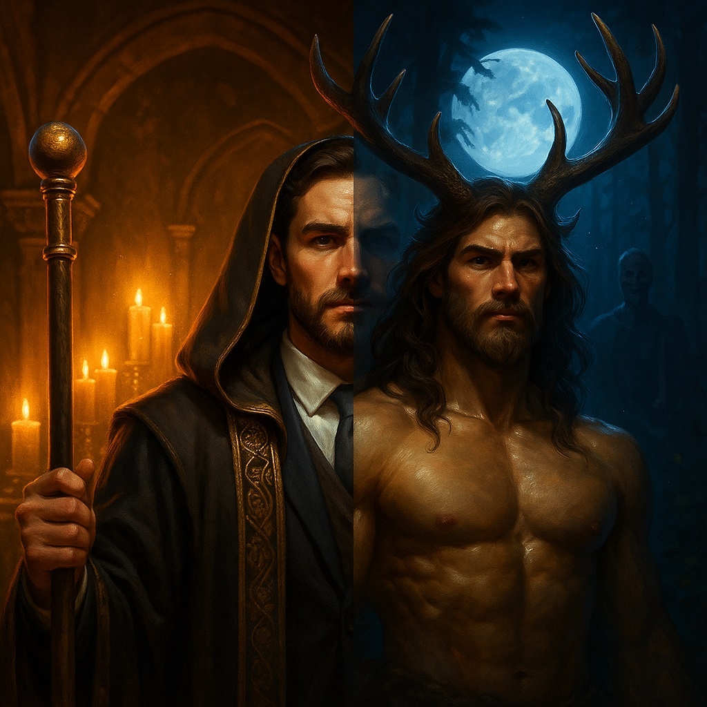 Город прожигает ночи неоном, но где-то под асфальтом ещё прячется эхо барабанов. В этом подземном ритме живёт древний образ — Рогатый, мужское божество леса и луны, охоты и страсти, мудрой дикости и свирепой нежности. Рядом с ним стоит Верховный Жрец — человек-мост между толпой и тайной, между шумом площади и тишиной алтаря. Спросите любого менеджера, студента, таксиста: «Кто сегодня мужчина?» — и услышите взрыв противоречий. Кто-то скажет «токсичный патриарх», кто-то — «лишний пол», третий — «вечный мальчик». Мы же нырнём глубже и проверим: может, современный парень ищет не карьеру на сорок часов в неделю, а давно забытый ритуальный рог, чтобы выкрикнуть миру собственное «Я ЕСМЬ!»