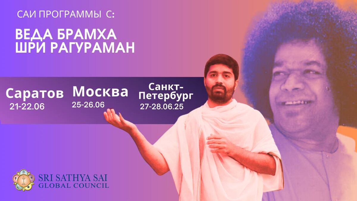 Участие Веда Брахма Шри Рагурамана в Саи программах в июне 2025 г. в России Участие Веда Брахма Шри Рагурамана – преданного Бхагавана в третьем поколении и выпускника музыкального колледжа Шри Сатья Саи в программах в июне 2025 г.: 20-22 июня – проведение Яджны, направленной на благо всех живых существ, в рамках Према-феста в г. Энгельс 25 июня – Сатсанг и Веды в Москве 26 июня – Сатсанг и Бхаджаны в Москве 27 июня – Сатсанг и Веды в Питере 28 июня – Сатсанг и Бхаджаны в Питере Теперь посмотрите, как это было. Обещаем, вы вдохновитесь ❤️