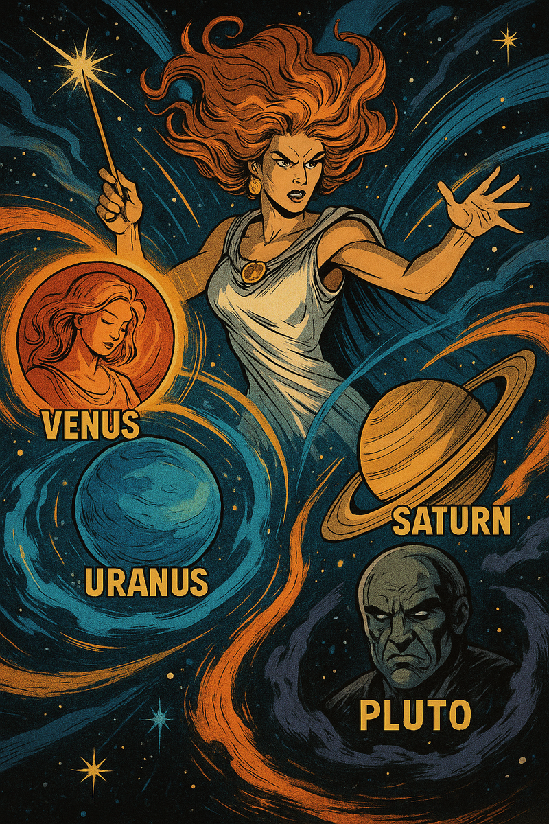 И ровно в момент перехода Венера нагоняет Уран — и как соединится с ним! А из-за кустов уже одобрительно машут Плутон с Сатурном: один — трин даёт, другой — в секстиле пляшет. Подбегают они к Урану с Венерой — и бац: случилась астрологическая симфония.