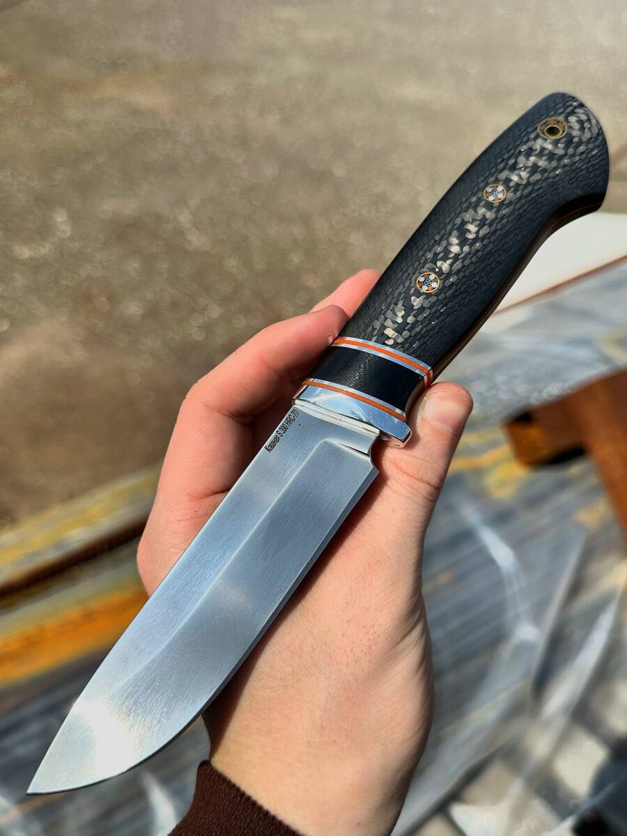 Рукоять на ноже выполнена из карбона с мозаичным пином.