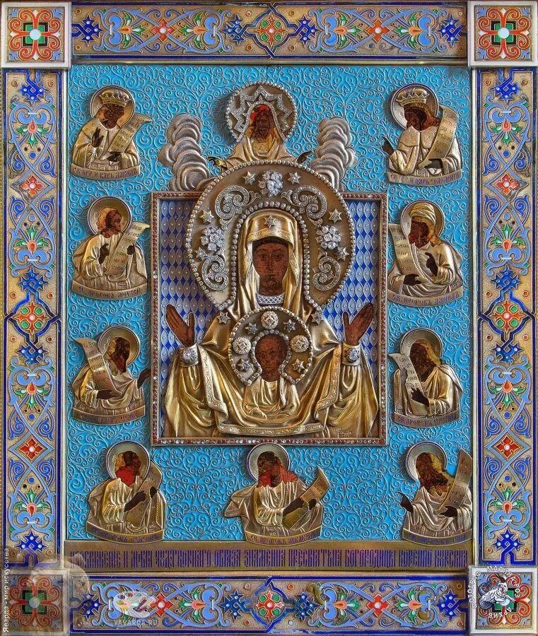 5 июля – день памяти иконы Божией Матери Знамение Курская-Коренная Икона Божией Матери «Знамение» Курская-Коренная является одной из древнейших икон Русской Церкви. Она была обретена в 1295 году недалеко от разрушенного в ходе татарского нашествия города Курска. Охотник нашел образ, лежащий у корней дерева, после чего на этом месте забил источник чистой воды. Изначально икона помещалась в деревянной часовне, построенной на месте обретения. Затем была перенесена в храм города Рыльска, но чудесным образом неоднократно возвращалась на место своего явления, что было воспринято как знак благоволения Богоматери к этому месту. С 1618 года, в память перенесения иконы из Москвы в Курск и явления иконы, установлен крестный ход, который ежегодно проводится в пятницу девятой недели после Пасхи. Икона переносится из Курского Знаменского собора в Коренную пустынь. Особая помощь Божией Матери через эту икону связана с важными событиями в истории России: освободительной войной русского народа во