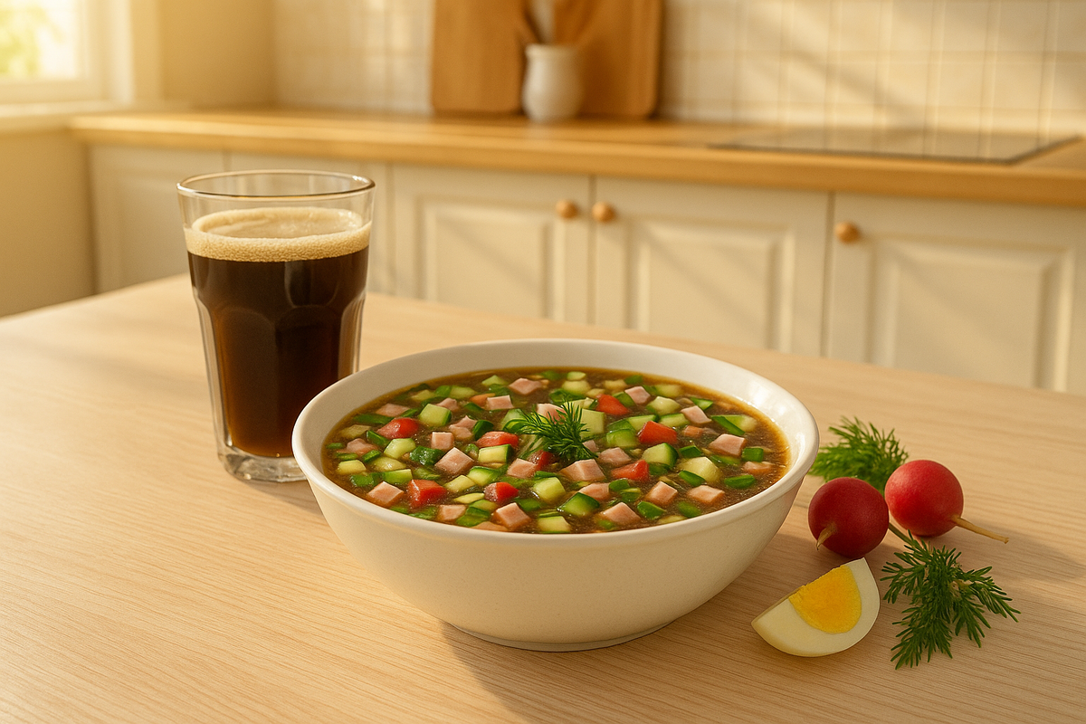 Окрошка особенно получится вкусной, если немного настоится в холодильнике (примерно 30–60 минут).