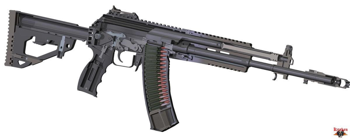 -поставить переводчик (сектор в сборе) на автоматическую стрельбу ("АВ"), автоматическую стрельбу с отсечкой очереди в два выстрела ("2", АК-12 тип 1 / 2) или одиночную стрельбу ("ОД"), отвести затворную раму назад до упора и отпустить ее. Автомат заряжен. Если не предстоит немедленное открытие стрельбы, то необходимо поставить переводчик (сектор) на предохранитель. При постановке переводчика (сектора) в любой режим стрельбы, ступенчатый вырез в крышке ствольной коробки для рукоятки затворной рамы освобождается, сектор переводчика не препятствует повороту спускового крючка. При отведении затворной рамы назад (на длину свободного хода), затворная рама, действуя передним скосом спирального выреза на ведущий выступ затвора, поворачивает затвор влево, боевые выступы затвора выходят из-за боевых упоров ствольной коробки - происходит отпирание затвора, выступ затворной рамы освобождает рычаг автоспуска, а шептало автоспуска под действием пружины прижимается к передней плоскости курка.