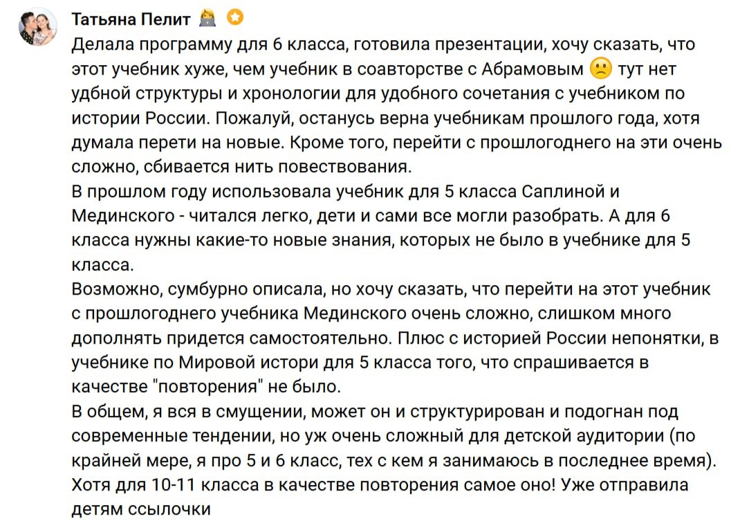 В ответ на пост А вот и первые впечатления от "единого учебника" Мединского-Чубарьяна по всеобщей истории 👀 Наша подписчица Татьяна заметила, что новый комплект не слишком удобен в работе. Особенно обратили внимание на сложность учебников для восприятия в 5-6 классах и проблемы со структурой, согласованностью с отечественной историей. Коллеги, как вам "единый" Мединский по всеобщей истории? Уже успели ознакомиться? #литература