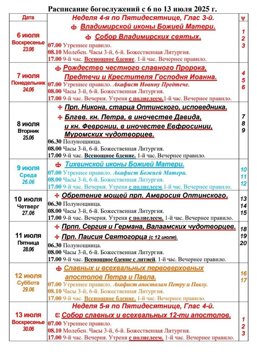06.-13.07.Расписание богослужений на Архиерейском подворье храма преп. Сергия Радонежского села Стоянцево