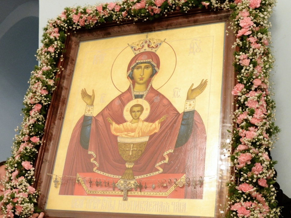 Святая икона «Неупиваемая Чаша» прекрасного старинного письма. Лик Матери Божией совершенно как живой. Что изображает эта икона? По-видимому, это точное изображение иконы Богоматери «Знамение». Только Богомладенец написан стоящим в чаше. Чаша с благословляющим Богомладенцем – это Чаша Святого Причащения. Чаша эта воистину есть неупиваемая, или неиспиваемая, потому что Агнец ее есть «всегда едомый и никогда неиждиваемый». А Матерь Божия с воздетыми вверх пречистыми руками, как могучий первосвященник, очевидно, ходатайствует, чтобы жертва сия – Святая Чаша – была принята в Принебесный Жертвенник за грешный род человеческий. И также нет другого наиболее верного средства приобрести нам любовь и благоволение Матери Божией, как через Причащение Святых Христовых Таин.