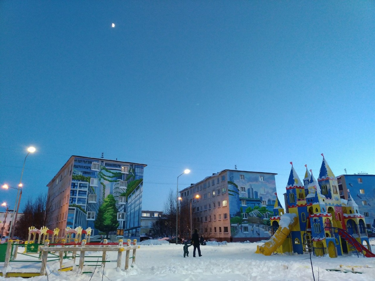 #Заполярный (Мурманская обл) Прямо за домом культуры — интересный полукруглый квартал из типовых пятиэтажек, часть из которых стала в 2017-м году полотном для довольно яркого триптиха на футуристическую тематику под названием "город будущего", из которого в итоге выросла инсталляция аж на все шесть пятиэтажек. Яркие краски резко котрастируют с облезающим бетоном панелей. © Георгий Абзианидзе