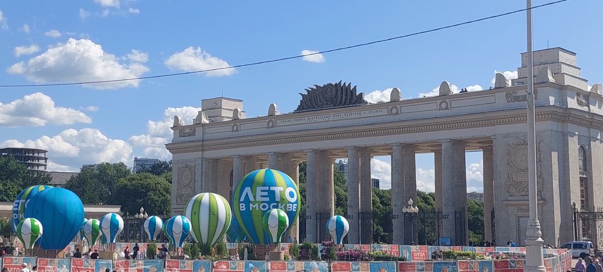 Признаюсь честно, я не знала о её существовании. Около года назад младшая дочь показала в тиктоке и посетить крышу ворот парка стало моей навязчивой идеей. Дошли до парка от станции метро Парк культуры. Прошли через Крымский мост. Видите стройку слева? Есть у меня подозрение, что строят новый речной вокзал. Северный и Южный у нас уже есть. А здесь явно будет Центральный. Билеты на смотровую продаются в левом пилоне ворот. Там же подъем наверх. На лифте или пешком на четвёртый этаж. На 4 этаже галерея с репродукциями картин. И выше сама смотровая. Всё удовольствие 300 рублей