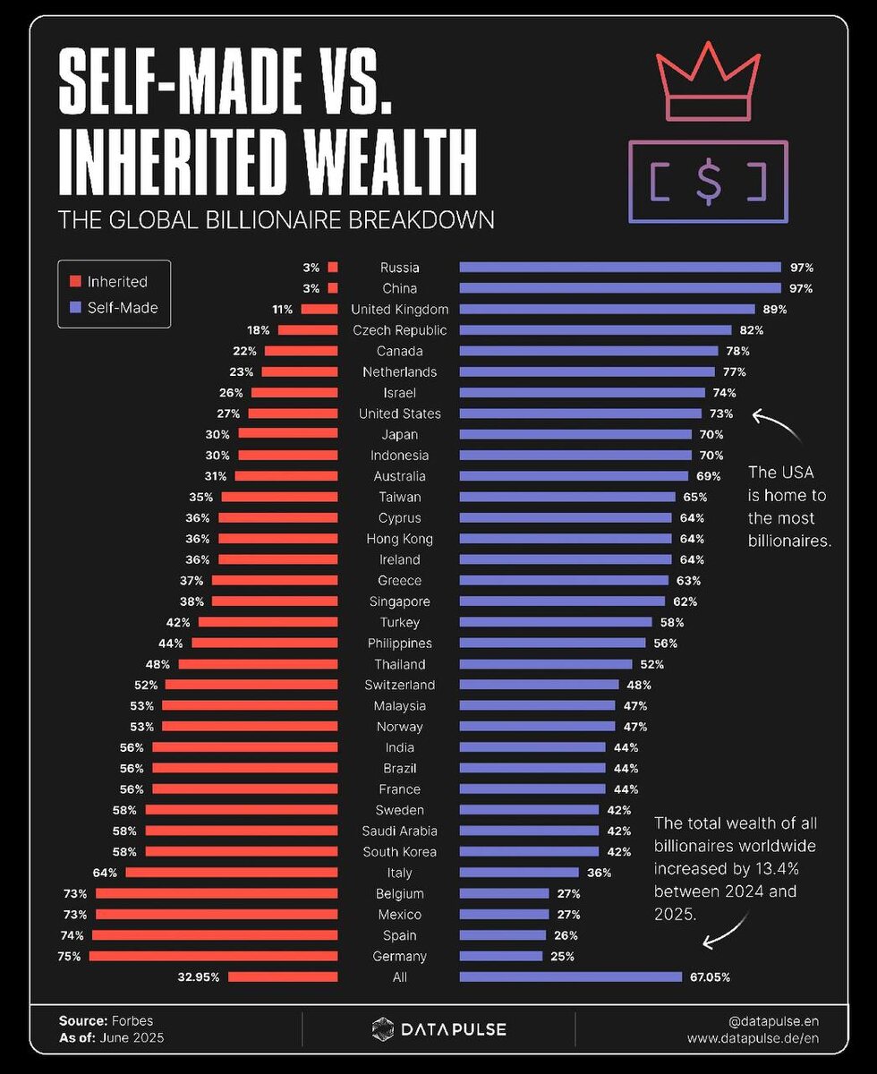 💸 Богатство: лучше заработать или унаследовать? Свежие данные Forbes показывают: почти 67% миллиардеров в мире сделали своё состояние сами, а не получили его от родителей. 😎 Россия и Китай тут настоящие «хардкорщики» - 97% миллиардеров self-made. В Германии, наоборот, только каждый четвёртый пошёл по пути предпринимателя, остальные получили капитал по наследству. А теперь внимание: общее состояние всех миллиардеров за год выросло на 13,4%. То есть, кто бы ты ни был, наследник старой династии или стартапер из гаража, быть богатым в 2025 году явно выгодно. Неплохая мотивация 😀 Telegram | YouTube