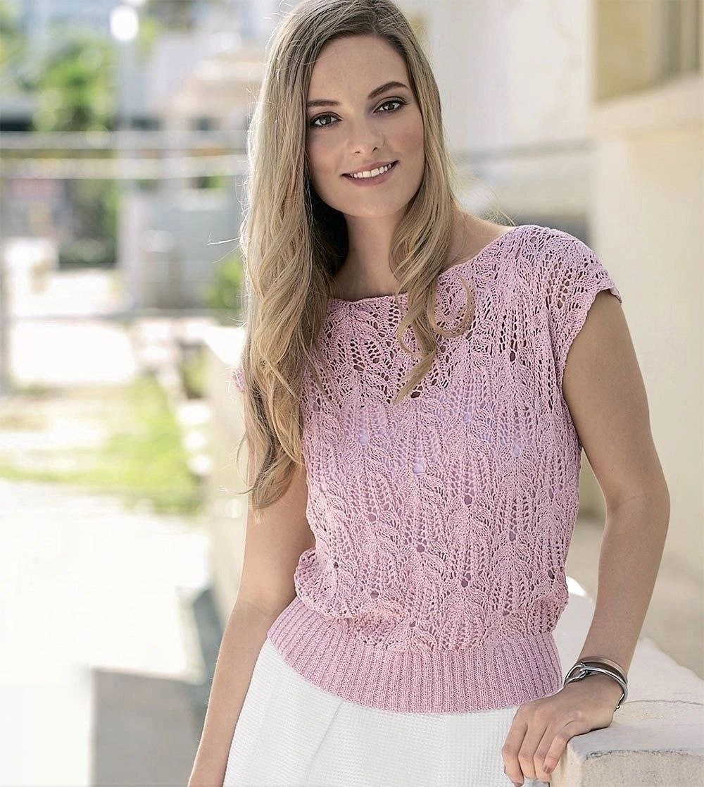 - Классические ажуры ("листики", "веера", ромбы): Простые, элегантные, универсальные. Идеальны для новичков, чтобы связать летний топ спицами.