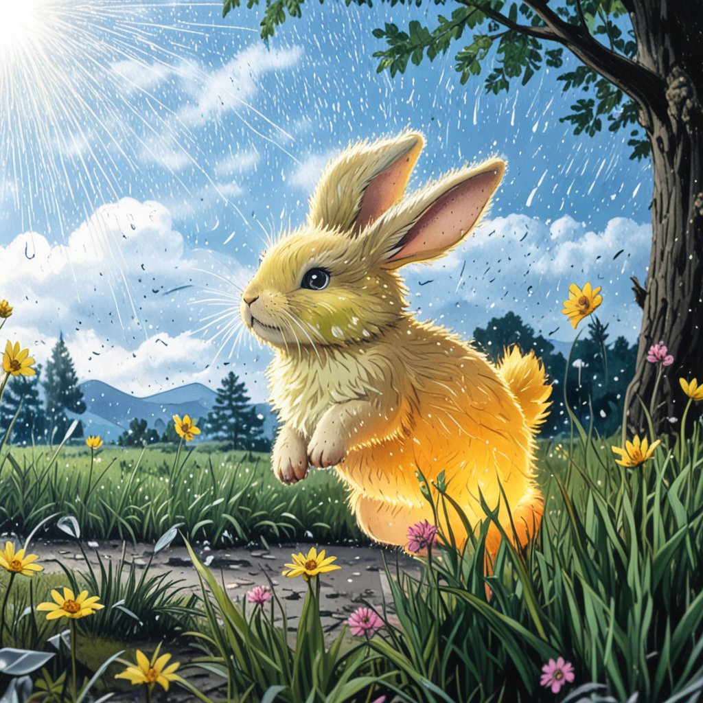 Жил-был в стране Света маленький Солнечный Зайчик. Он был соткан из самых ярких лучей солнца и всегда был веселым и озорным. Зайчик любил играть с детьми, отражаться в лужах и окнах, и везде, где он появлялся, становилось светло и радостно. Но однажды на небе появилась большая серая Тучка-Плакса. Она была очень грустной и постоянно плакала дождиком. Там, где проплывала Тучка, все становилось серым и мокрым. "Почему ты такая грустная?" - спросил Солнечный Зайчик, когда встретил Тучку над полянкой. "Все меня боятся," - всхлипнула Тучка. "Говорят, что я порчу их планы, заставляю сидеть дома и мешаю играть на улице. Никто не хочет со мной дружить." Солнечный Зайчик задумался. Он посмотрел вниз и увидел, что цветы на поляне выглядят уставшими от жары. "А знаешь что," - сказал он Тучке, - "я думаю, ты совсем не вредная. Посмотри, как цветочки обрадуются твоему дождику!" Тучка удивилась: "Правда? Но все говорят, что солнце лучше дождя." "Это неправда," - ответил Зайчик. "Без дождя все живое