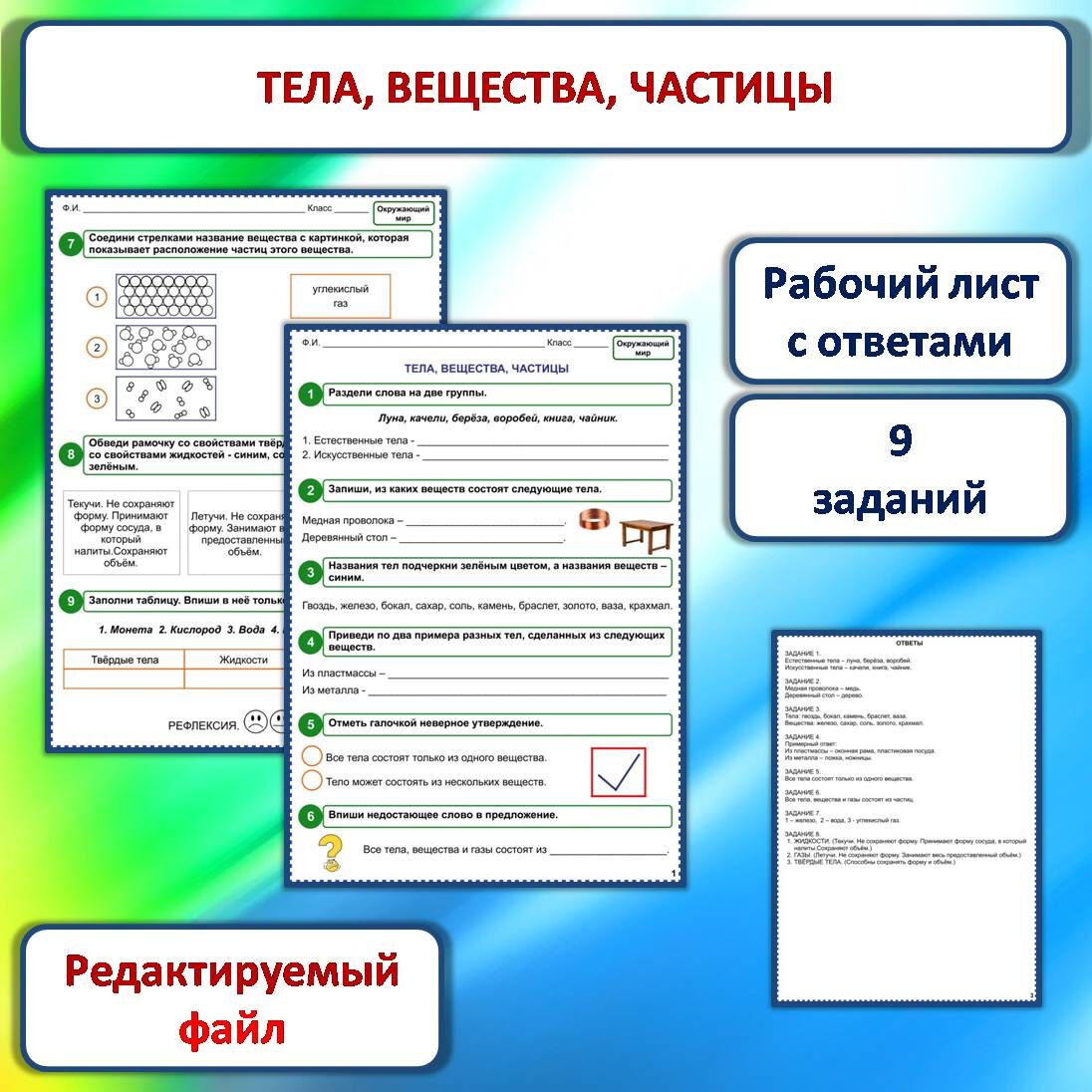 Задание 3. Названия тел подчеркни зелёным цветом, а названия веществ – синим.