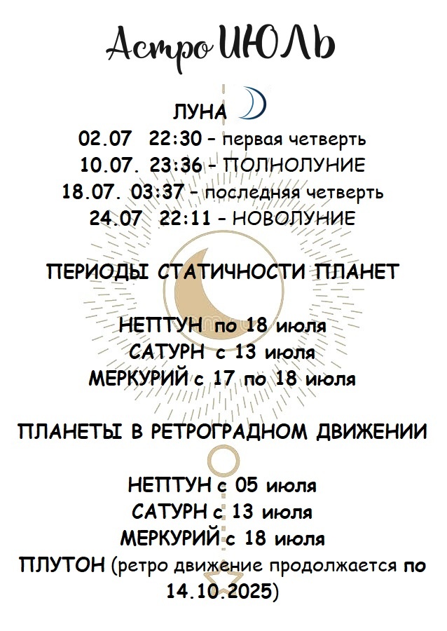 ОБЩИЕ глобальные тренды, закладываются в ИЮЛЕ. Начинается новый энергетический период, т.к. все высшие (медленные) планеты переходят в новые знаки зодиака. Это означает только одно: абсолютно каждого человека затронет эта «история»: новый этап в жизни, перемены, переезды, завершение старого – начало нового, или дела, которые стопорились вдруг начинают реализовываться. Могут трансформироваться отношения, появляются новые идеи. УРАН – переходит в знак БЛИЗНЕЦЫ 07.07.2025. Там он делает петлю, возвращается в знак Тельца и уже с мая 2026 останется в Близнецах до 2033 года! Петля Урана на границе знаков – это те самые события, которые будут разворачиваться в жизни каждого в ближайшие полгода. У кого какие? Это уже зависит от вашей натальной карты, а именно за какую сферу жизни у вас отвечает Уран: кто-то поменяет работу, кто-то начнет работать над внешностью, у кого-то начнутся новые яркие отношения, а кто-то откроет дело своей мечты. НЕПТУН и САТУРН – замедляются и с 05.07.2025 переходят в