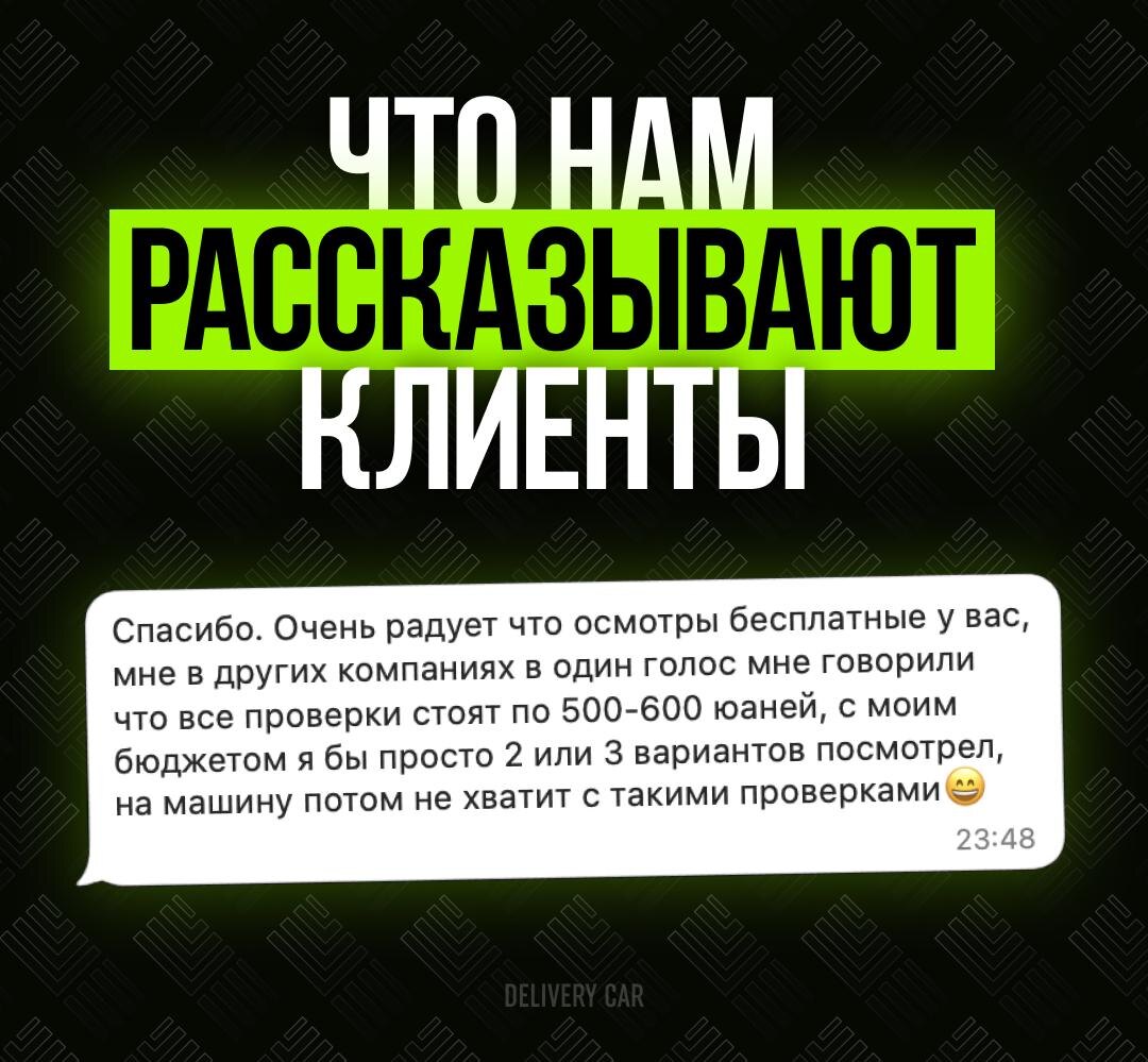 ПОЧЕМУ НАС ВЫБИРАЮТ?👀💬 Вот что пишет один из клиентов после первых осмотров: “Спасибо. Очень радует, что осмотры бесплатные у вас. В других компаниях в один голос говорили, что все проверки стоят по 500–600 юаней. С моим бюджетом я бы просто 2–3 варианта посмотрел, а на саму машину потом не хватит 😄” Мы это читаем — и честно, сами кайфуем. Потому что делаем всё правильно. У нас — бесплатные осмотры в неограниченном количестве!🔍 📸 Видео с толщиномером, фото, проверка баз, ЛКП, кузов, салон, двигатель, днище, ГУ — всё входит в отчет абсолютно бесплатно Без доплат. Без сюрпризов. Без уведомлений "С вас 600 юаней за проверку, и не важно, что машина не подошла" Это помогает клиенту спокойно выбирать авто, не считая каждую проверку как "минус от бюджета" Хотите проверить — обращайтесь по кнопке "ОСТАВИТЬ ЗАЯВКУ". Покажем, как это выглядит на практике!🤝🏼 🌐 Сайт компании: https://доставка-автомобилей.рф 📲 Звонить | 8 (800) 600-46-24 📝 Отзывы о нас: 2GIS | VL.RU 💱 Бесплатны