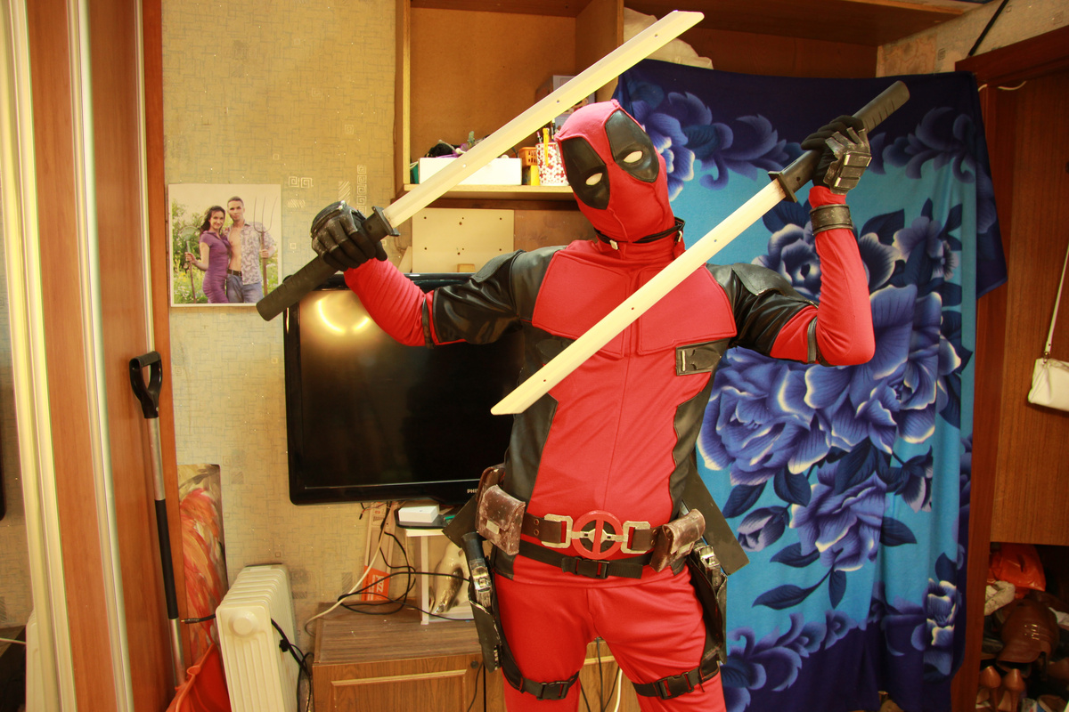Мой первый полноценный cosplay костюм, это был DeadPool! Именно с него началась моя история косплей костюмов и фестивалей (не считая Богатыря который на тот момент ещё лежал не законченным) Угадайте из чего лезвие у катан?) Костюм был собран за 2 недели, поучаствовал в 7ми мероприятиях и выиграл 2 Cosplay конкурса. Это был интересный опыт и безумное начало пути косплеера