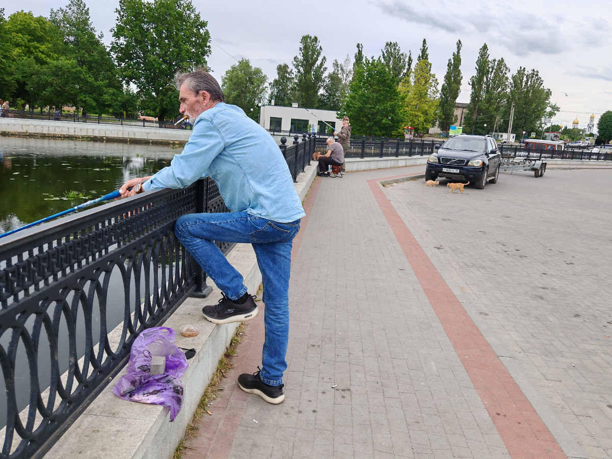 Народ так расстраивался за моего мужа, что мне аж было неловко. В субботу накопала в саду толстеньких червяков и говорю: "Поехали в Полесск, там рыба есть". Долго уговаривать Мариуса не пришлось, естественно. Приехали, я его пристроила на набережной по соседству с единомышленниками и пошла погулять по берегу.
