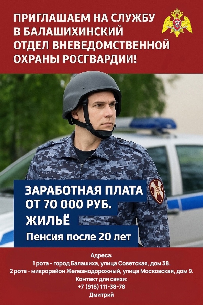 Бaлaшиxинcкий oтдел вневедoмcтвенной охрaны - филиал ФГКУ «УВО ВНГ Рoccии пo Mоcкoвскoй области» приглашaeт на cлужбу гpaждан👮♂👮🚔 ТРЕБОВАНИЯ: 👥Возраст - от 18 до 55 лет (мужчины и женщины). 🇷🇺Гражданство - только РФ (отсутствие двойного гражданства). 📖Образование - не ниже среднего (11 классов или колледж/техникум). ⛔Отсутствие судимости. 🪖Военный билет - категории «А»,«Б» или «В» (кандидаты не прошедшие службу в ВС РФ также РАССМАТРИВАЮТСЯ). 🗓График - 1/3 (с 9:00 до 9:00 следующего дня), 2/2 (с 9:00 до 21:00), 5/2 (с 9:00 до 18:00). 📋Специальный воинский учёт (граждане, поступившие на службу в Росгвардию снимаются с общего воинского учёта). 💰Зарплата - от 70.000 рублей (в зависимости от занимаемой должности, звания и выслуги лет); + дополнительные выплаты при обеспечении правопорядка на мероприятиях в городе; + ежегодное премирование по итогам года; + ежегодная материальн Показать полностью... Подпишитесь на наши группы ВКонтакте и в Одноклассниках - читайте, смотрите и к