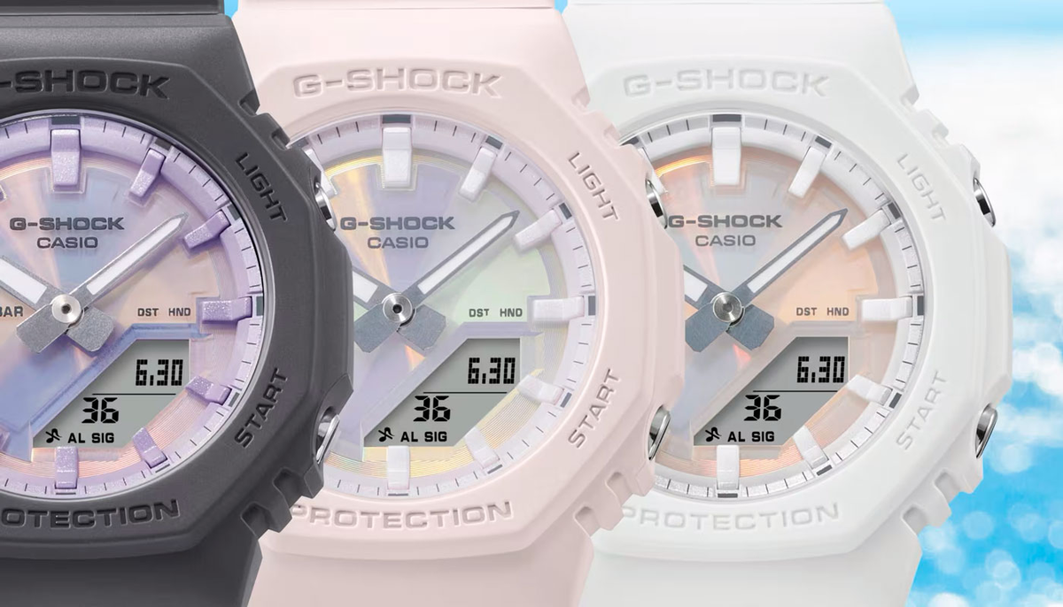 Начинаем потихоньку подбираться к новинкам июля и начать предлагаем с GMA-P2100PC — свежих и ярких расцветок самой компактной версии 2100-го корпуса. Серия относительно новая (вышла в продажу в начале 2024 года), и уже успела зарекомендовать себя как недорогая и более прочная альтернатива женским BABY-G.