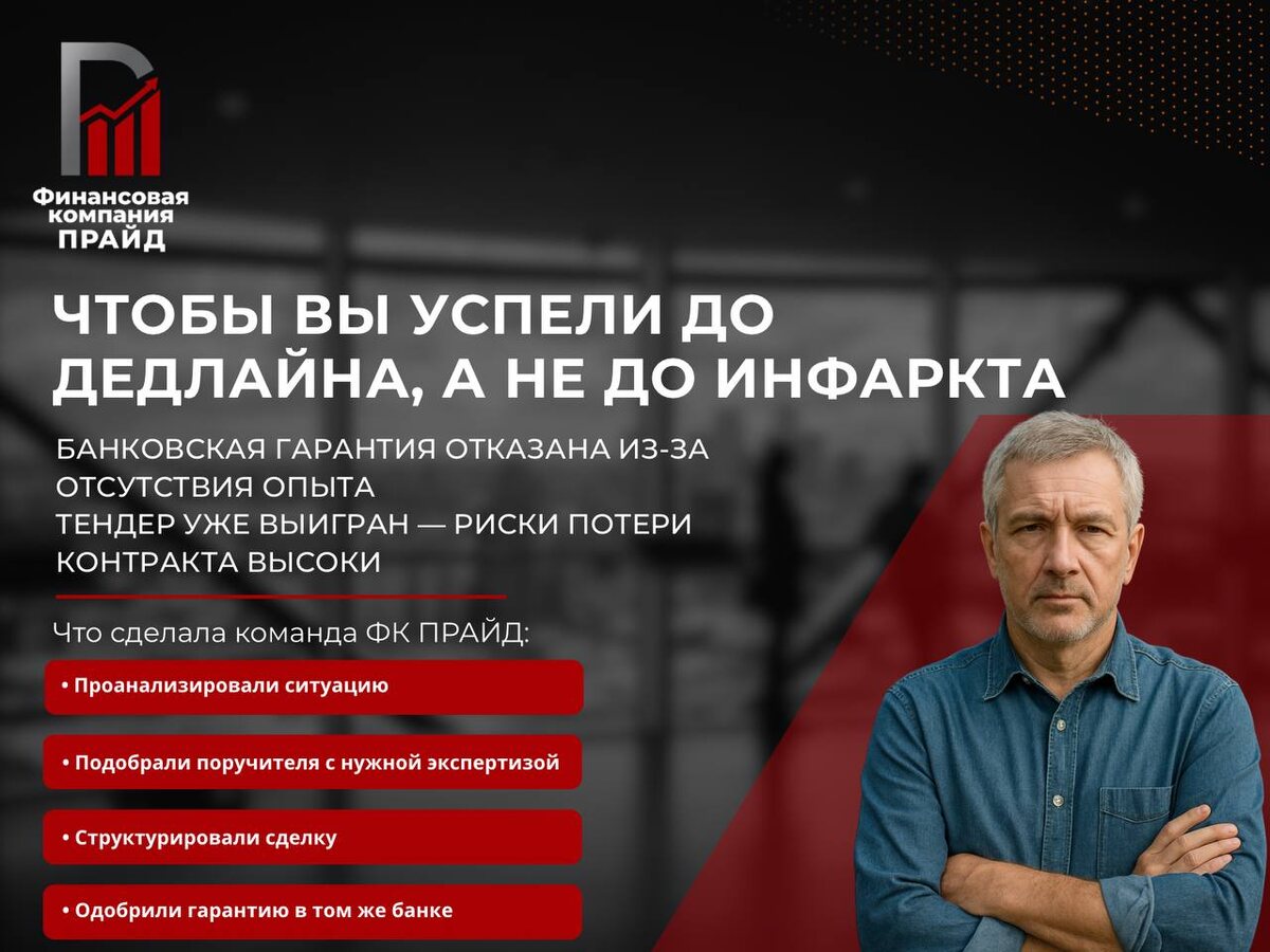 ❗️«ЧТОБЫ ВЫ УСПЕЛИ ДО ДЕДЛАЙНА, А НЕ ДО ИНФАРКТА» ❗Клиент: Антон Кобяков Руководитель электро-монтажной компании Контракт на 360 млн рублей ❗Проблема: Банковская гарантия отказана из-за отсутствия опыта Тендер уже выигран — риски потери контракта высоки 🦁 Что сделала команда ФК ПРАЙД: ❗️Проанализировали ситуацию ❗️Подобрали поручителя с нужной экспертизой ❗️Структурировали сделку ❗️Одобрили гарантию в том же банке "Не просто помогли — спасли. Отдельное спасибо Юрию!" — Антон К. ❗ Мы не ищем отговорки — мы ищем решение. ❗И находим его. 🌎Официальный сайт – fc-pride.ru ❗ 📞Номер телефона - +79036960066 ❗ ФК ПРАЙД — когда дедлайн ближе, чем кажется.