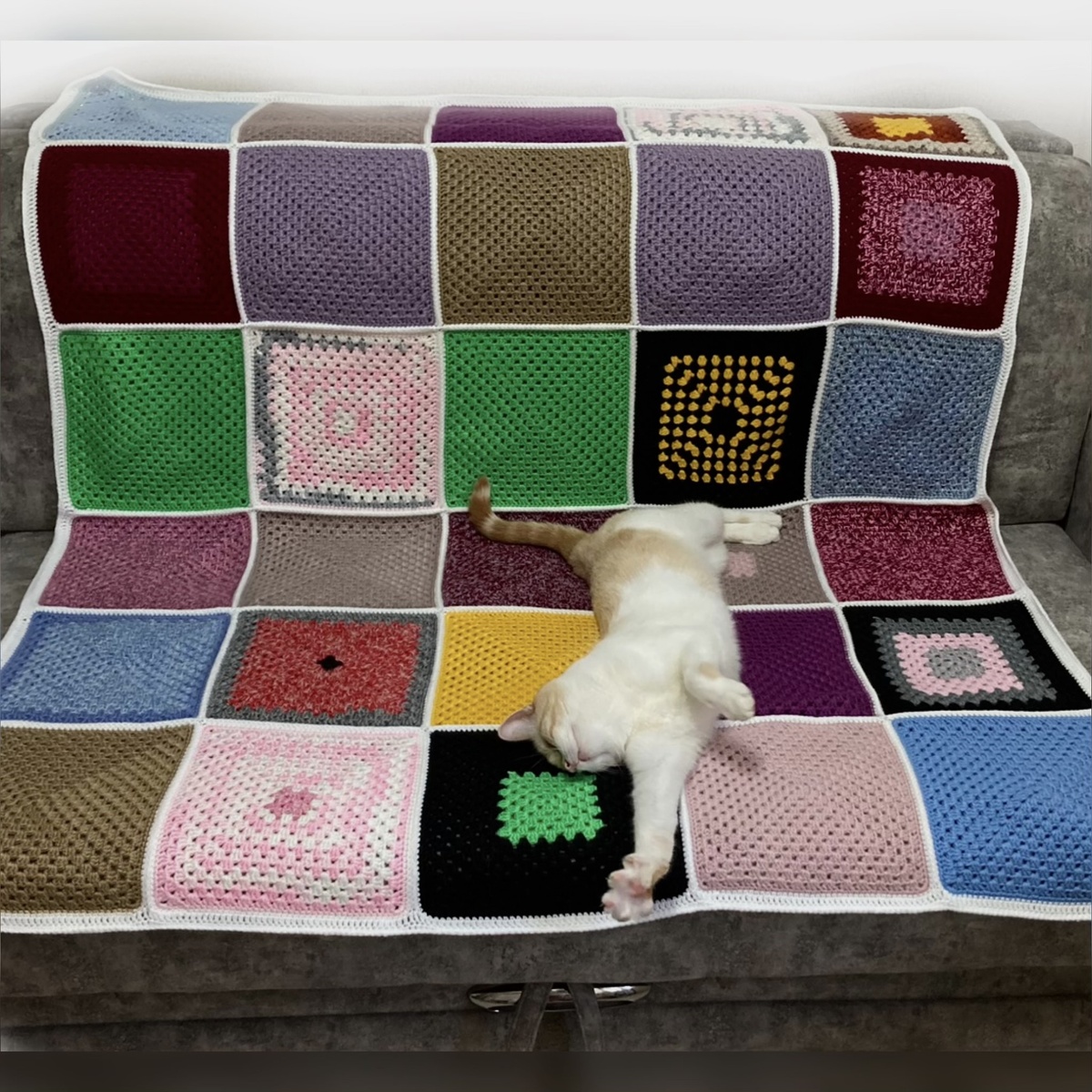 Это уже четвертый дачный плед из остатков пряжи. Размер 125х145 см с обвязкой. Вы поняли уже, кто его опробовал и кому он понравился. Без эксперта Василия ни куда ☺️ Вот кто истинный ценитель моих изделий 🤣 и на зубок, и коготками, и просто отдохнуть. И плед уже на даче 😉