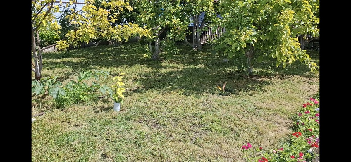 Добрый вечер, дорогие друзья! Ну начнем с того, что денек сегодня выдался замечательный- солнечный, теплый, с легким ветерком и первый, за последнее время, без дождя. С утра, с созревшим планом, мы рванули на дачу- пока хорошая погода надо скосить траву на участке, где плодовые деревья. Муж косил, мы с сыном сгребали, убирали и резали серпом в тех местах, где триммеру не достать. Площадь большая, но трава с прошлой стрижки выросла не высокая, так что справились. Теперь у нас красота- любо- дорого посмотреть. Потом, я как всегда, после всех грандиозных работ, пошла по своим огородным тропам- посмотреть и продегустировать, весь созревший и не очень, урожай. Это мое обязательное и любимое дело. Начинаю я свой обход с правой стороны огорода- тут растут мои любимые цветочки (как же ими не полюбоваться), поспевающий крыжовник (пока еще кислющий, но это не беда, кисленькое я обожаю и мимо не пройду, чтоб не сорвать и не положить в рот). В конце огорода смородина, красная, белая, чер