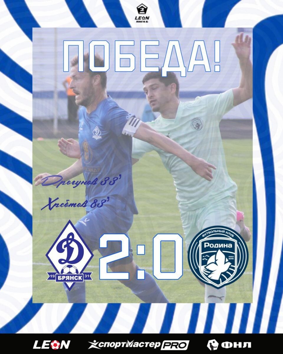 Завершился матч Второй Лиги, Дивизиона Б, между командами “Динамо-Брянск” и “Родина-М”. Брянские динамовцы одержали победу со счетом 2:0. Первый гол в матче был забит на 33-й минуте Дмитрием Дрогуновым. Во втором тайме, на 83-й минуте, преимущество “Динамо” закрепил Александр Хребетов. Благодаря этой победе “Динамо-Брянск” поднялось на вторую строчку в турнирной таблице. “Родина-М”, в свою очередь, остается на 9-м месте. Следующий матч “Динамо-Брянск” проведет 26 июня в 18:00 против “СКА-Хабаровск 2” (6+).