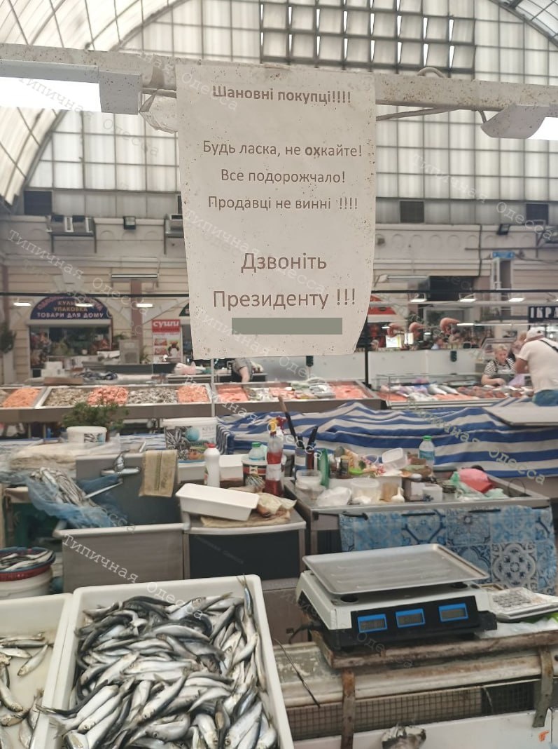 «Пожалуйста, не охайте. Всё подорожало! Продавцы не виноваты. Звоните президенту», - гласит надпись на табличке. Что тут скажешь, люди прекрасно понимают, кто виновник их бед. Как ни крути, экономика страны в целом и Одессы в частности напрямую зависит от выбранного политического курса. Когда чиновники совершаю ошибки, цены мгновенно реагируют на негативные изменения.