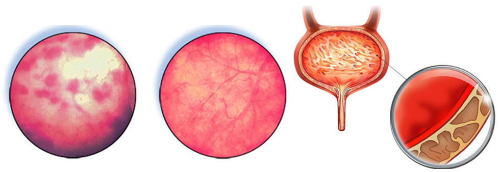 - При ИЦ воспаление распространяется за пределы эпителиального слоя, сопровождается фиброзными изменениями стенки мочевого пузыря, нередко приводя к уменьшению его емкости и сморщиванию.