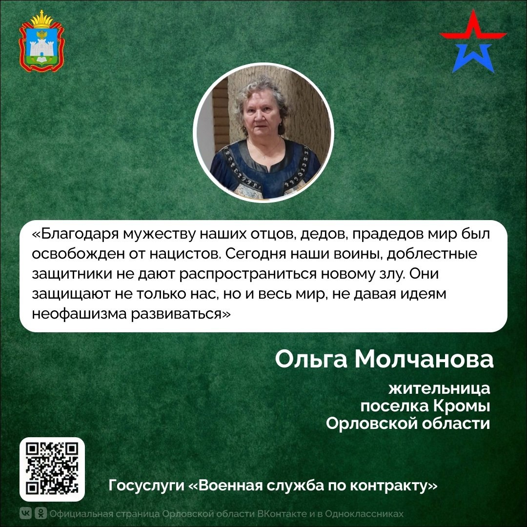 Жители Орловской области продолжают следить за ситуацией в приграничных районах соседних областей. Орловские мужчины выбирают службу по контракту, чтобы защищать Отечество. «Благодаря мужеству наших отцов, дедов, прадедов мир был освобожден от нацистов. Сегодня наши воины, доблестные защитники не дают распространиться новому злу. Они защищают не только нас, но и весь мир, не давая идеям неофашизма развиваться», — говорит жительница поселка Кромы Орловской области Ольга Молчанова. Государство оказывает защитникам Отечества поддержку. Орловцы, заключившие контракт, получат единовременные выплаты в размере 800 тысяч рублей. Ежемесячная заработная плата военнослужащих в зоне СВО - от 210 тысяч рублей, плюс дополнительные стимулирующие выплаты. Адрес пункта отбора на военную службу по контракту: г. Орёл, ул. Октябрьская, д. 30, тел. 8-915-509-05-82.