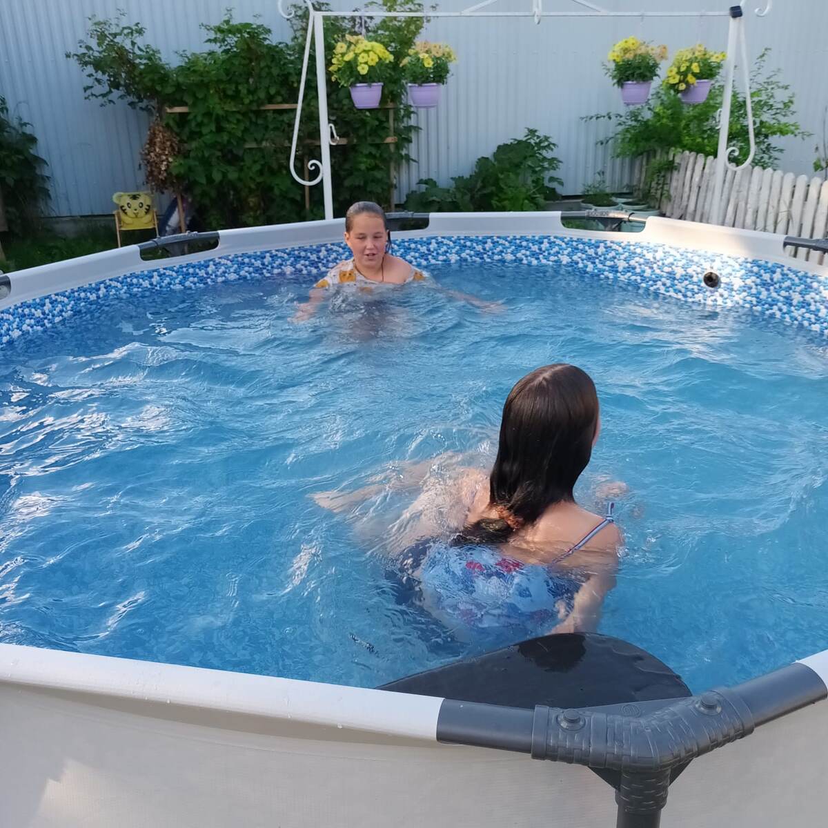 Всем привет! Сегодня я была у своей лучшей подруге в гостях, а она живет в саду где я живу не подалеку и я частенько хочу к ней в гости. На ее участке стоит бассейн и мы там тоже очень часто плаваем! Бассейн в быту Бассейн — сооружение, которое может использоваться для купания, отдыха или купания после банных процедур. Бассейны бывают разных видов, например: Мы с моей подругой очень любим нырять или как то кувыркаться под водой!! Мы придумываем разные движения и повторяем их! Сейчас я покажу фотки с бассейна. Вот: