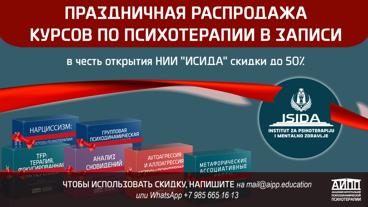 ⚡В честь открытия "Исиды" мы объявляем праздничную акцию на курсы повышения квалификации в записи: 1⃣ При покупке 1-го курса скидка 10% 2⃣ При покупке 2-х курсов скидка 30% 3⃣ При покупке 3-х и более курсов скидка 50% Все, кто приобретал наши курсы в записи в 2025 году, получат еще и ДОПОЛНИТЕЛЬНУЮ СКИДКУ 5%. 🧐 Курсы, которые участвуют в акции: 🔥 АУТОАГРЕССИЯ И АЛЛОАГРЕССИЯ: МЕТОДЫ ПСИХОТЕРАПИИ - мощная система для детоксикации психики и тела от накопленной подавленной агрессии. Дает целебный эффект при работе с широким кругом расстройств, улучшает самооценку и межличностны