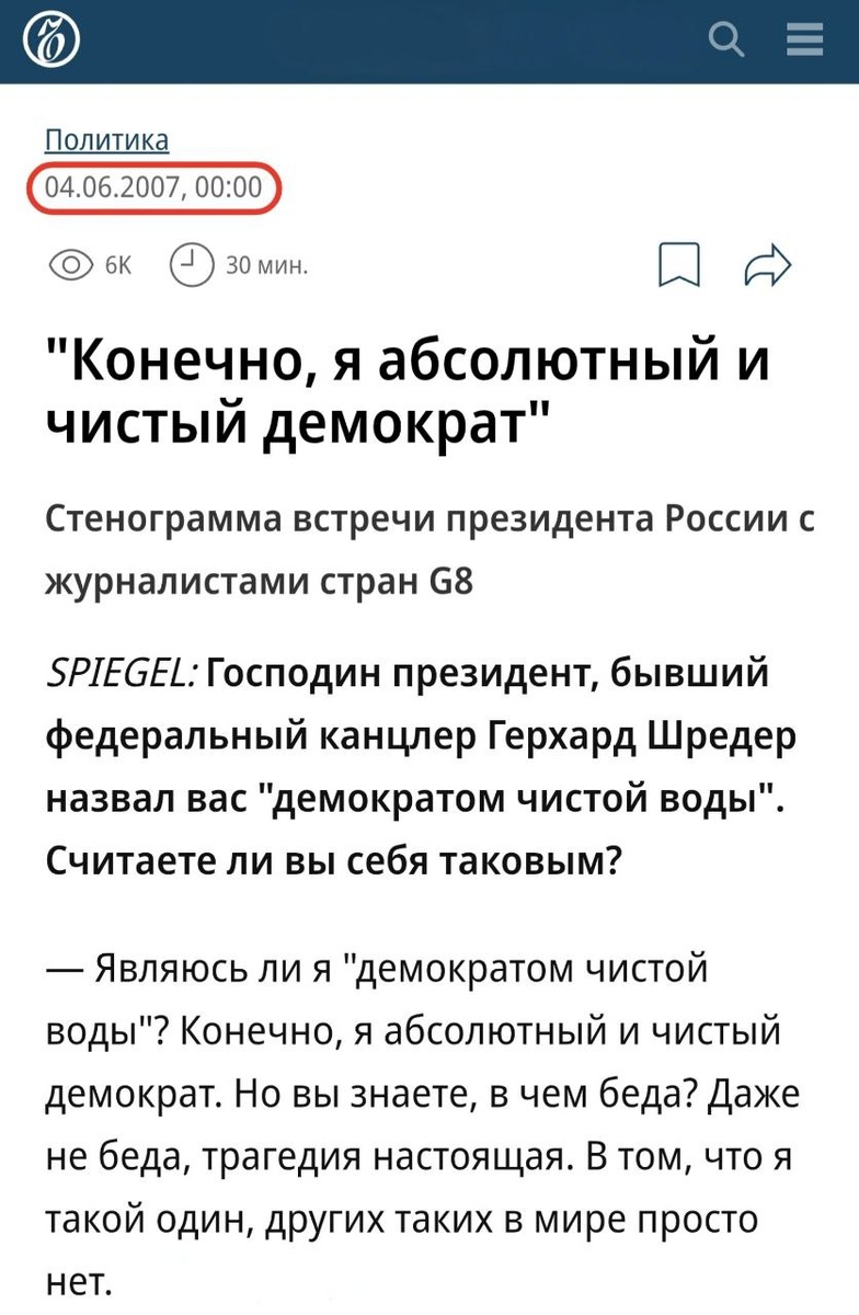 🗣Путин: «Я абсолютный и чистый демократ...» ~ 4 июня 2007 года В интервью немецкому журналу Der Spiegel на полях саммита G8 Владимир Путин скромно назвал себя уникальным демократом: "Я абсолютный и чистый демократом. Но вы знаете, в чем беда? Даже не беда, трагедия настоящая — в том, что я такой один, других таких в мире просто нет… После смерти Махатмы Ганди поговорить не с кем" – рассказывал Путин Путин, комментируя "состояние демократии" в мире, критиковал положение дел в США, в Европе и на постсоветском пространстве. #Россия #Путин 🏛History_detail. Подписаться