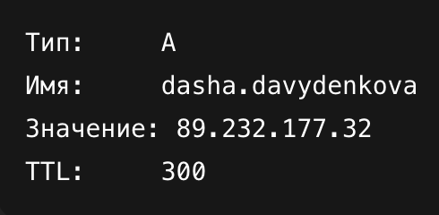 Подожди 5–10 минут — иногда до 1 часа — пока запись обновится. Проверь так: dig dasha.davydenkova.alexproai.ru +short sudo mkdir -p /home/alexadmin/dev/dasha.davydenkova.alexproai.ru sudo cp -r /home/alexadmin/dev/alexproai.ru/* /home/alexadmin/dev/dasha.davydenkova.alexproai.ru/ sudo mkdir -p /var/www/dasha.davydenkova.alexproai.ru # Сюда положи: index.html, favicon.ico, avatar.jpg, styles.css sudo cp -r /home/alexadmin/dev/dasha.davydenkova.alexproai.ru/* /var/www/dasha.davydenkova.alexproai.ru/ Проверь права: sudo chown -R www-data:www-data /var/www/dasha.davydenkova.alexproai.ru Создай файл: sudo vim /etc/nginx/sites-available/dasha.davydenkova.alexproai.ru Вставь: server { listen 80; server_name dasha.davydenkova.alexproai.ru; root /var/www/dasha.davydenkova.alexproai.ru; index index.html; location / { try_files $uri $uri/ =404; } } Активируй сайт: sudo ln -s /etc/nginx/sites-available/dasha.davydenkova.alexproai.ru /etc/nginx/sites-enabled/ Проверь и перезапусти: sudo nginx -t