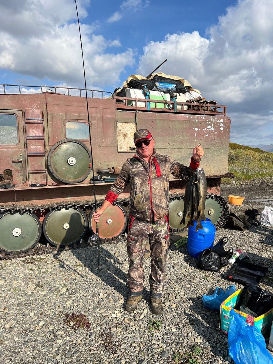 Каждое поездка на Чукотку - это всегда удачная рыбалка. Вот и в путешествии Чукотка-Камчатка рыбалка была одной из основных целей этого приключения. Рыба есть в каждой речке, даже если воды в ней сантиметров 15. И эта рыба клюет. Основной улов - это хариус от 1 до 1,5 кг (меньше не попадался), голец (его поймали 7 или 8 видов). В озерах голец ловился до 4 кг, в реке 1-1,5 кило, доходило до того, что искали приманки, на которые клевать не будет... Конечно, основные - это вертушки размером от 3 до 6 см, воблеры с заглублением до метра, но которые хорошо держат струю, так как во всех реках мощное течение. Но привычных для жителя средней полосы видов рыб там нет. Клюет всегда. Поймать можно столько, сколько нужно. Мы брали на еду из рассчета один человек - одна рыба . Конечно, на тех, кто ходит по реке со спиннингом, была возложена повинность - ты поймал-ты почистил, поэтому на третий день наш рацион состоял из одних гольцов- нет чешуи , проще чистить. Хариусы благополучно отправлялись