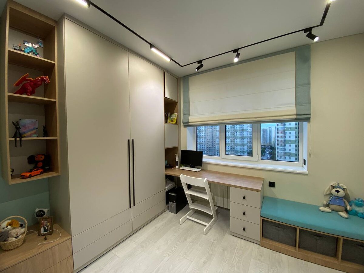 Когда стол стоит вплотную к окну, то неплохим решением будет римская штора. Усиленный механизм с лёгкостью поднимет штору такого большого размера (более 2-х метров в ширину) Горчичного цвета кант украшает изделие, перекликается с декоративными элементами комнаты и добавляет динамики в текстильное оформление. Ткани разных фактур красиво дополняют друг друга и органично вписываются в цветовую гамму комнаты ребёнка. Также сюда будет сшито интересное покрывало на кровать и декоративные подушки с кантами. Продолжение следует)