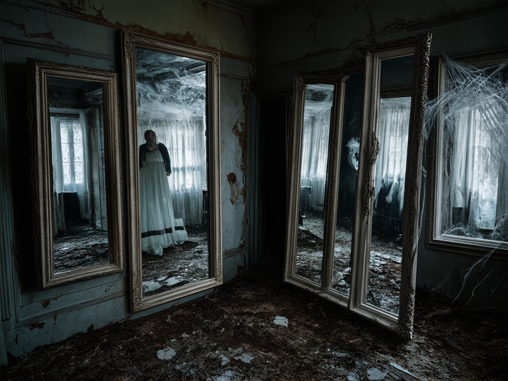 В старинном доме, где паутина правит, Где лунный свет лишь слабо проникает, Стоит зеркало, древное и хрупкое, С секретами, что в вечности хранят. Оно не отражает свет и радость, Лишь тени прошлого, гнетущую мглу. Зеркало шепчет имена ушедших, И манит в бездну, где надежды нет. Ходили слухи, что зеркало проклято, Что души заточены внутри него. Говорят, если долго на него смотреть, Оно заберет тебя, не отпустит ни на миг. Молодая девушка, любопытная и смелая, Решила проверить эти страшные слова. Она стояла перед зеркалом, смотря в его глубину, Ища отражение себя, но видя лишь страх. Вначале лишь легкий шепот, словно ветер, Потом образы, размытые, неясные. Лица знакомые, но искаженные гримасой, И руки, тянущиеся из темноты. Она отвернулась, испугавшись, Но шепот вернулся, стал громче и ближе. И вдруг, в отражении, она увидела… Не себя, а кого-то другого, стоящего рядом. Она закричала, отшатнулась, упала, Попыталась убежать, но не получилось. Отражение в зеркале улыбнулось ей, И протянуло