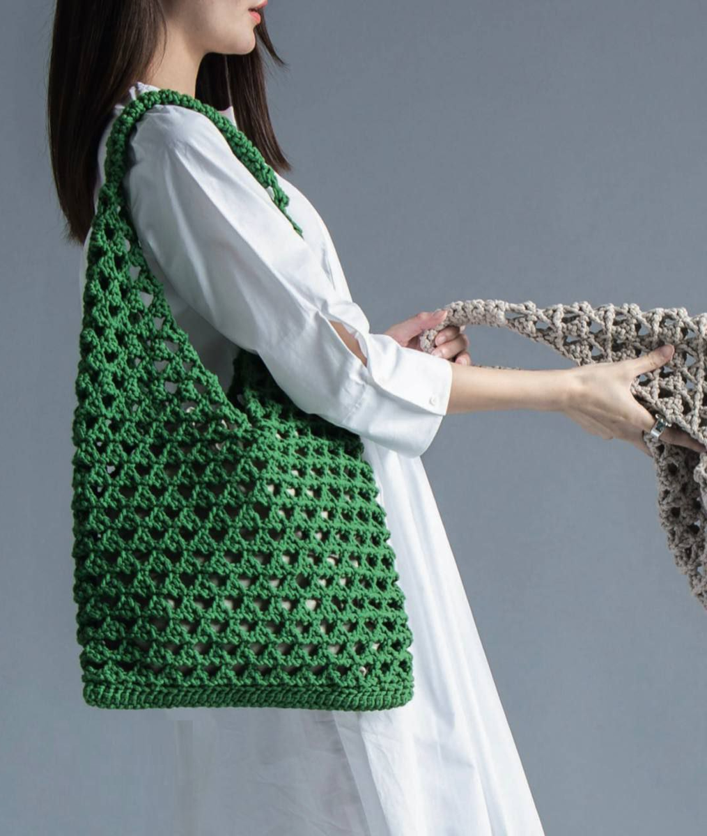 - Объёмные шопперы и тоут-багги: Просторные, удобные, часто вязаные из толстой текстурированной пряжи "травка" или сизаля в эко-стиле.