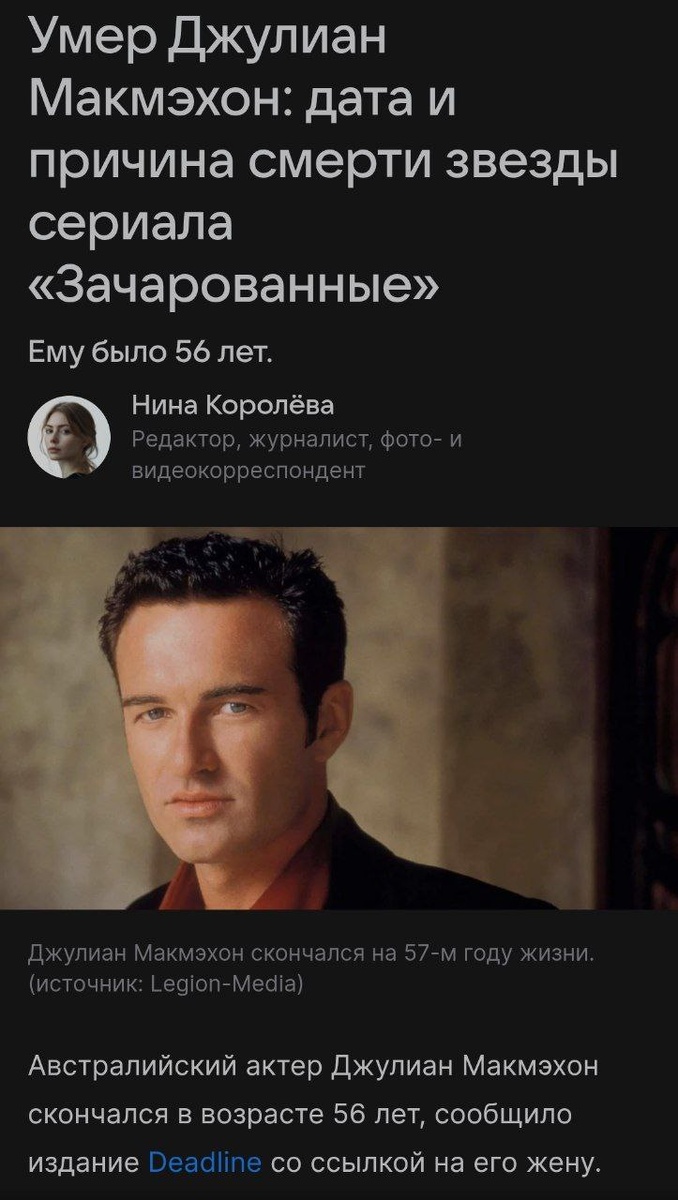 Когда уходят те, от кого фанатели мы... Недавно Шеннен Доэрти, теперь вот Джулиан Макмэхон (это уж я молчу про Мэттью Перри)... Теперь "Зачарованные" и без Прю, и без Коула... Грустно. Этот сериал очень большая часть моего детства/юности 😔