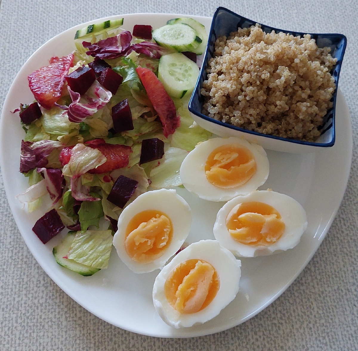 На завтрак я сварила 2 яйца. Киноа у меня осталось ещё готовое. Отмерила 120 г. Добавила салатик с ложкой масла.